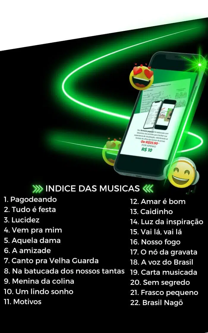 Seu formato popular foi elaborado com desenhos dos acordes para facilitar sua experiencia de visualização, relembrando as revistas de cifras das bancas de jornais